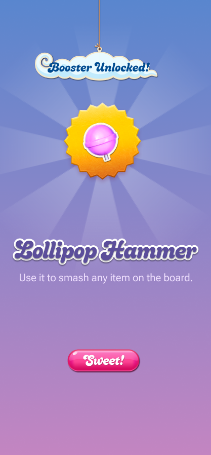 "Candy Crush Saga's character mascots are under-utilized. We explored inserting the characters to celebrate the unlock moment, without taking away focus from the booster."