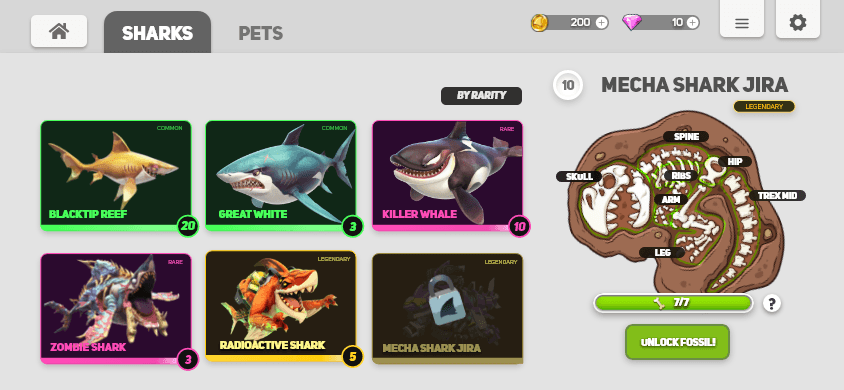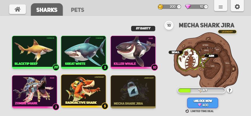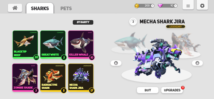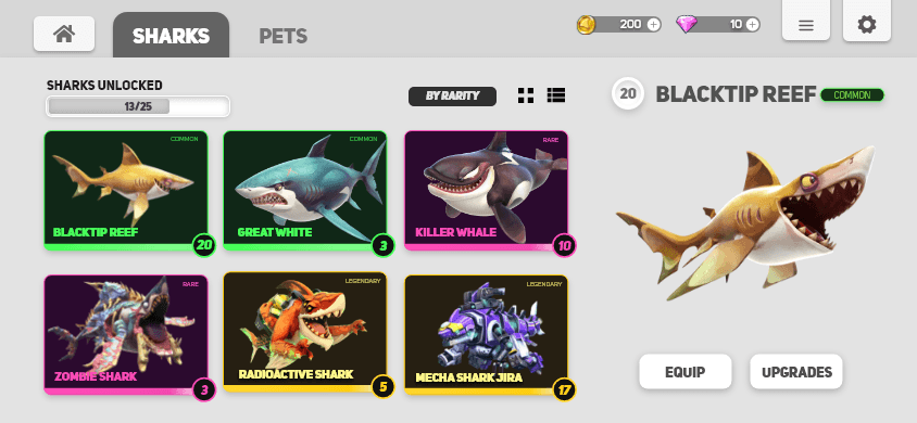 Character rarity tiers create clear value hierarchy and aspirational collection goals. Visual differentiation through color coding and particle effects instantly communicates each character's prestige level, driving engagement through the desire to unlock increasingly rare and powerful sharks.