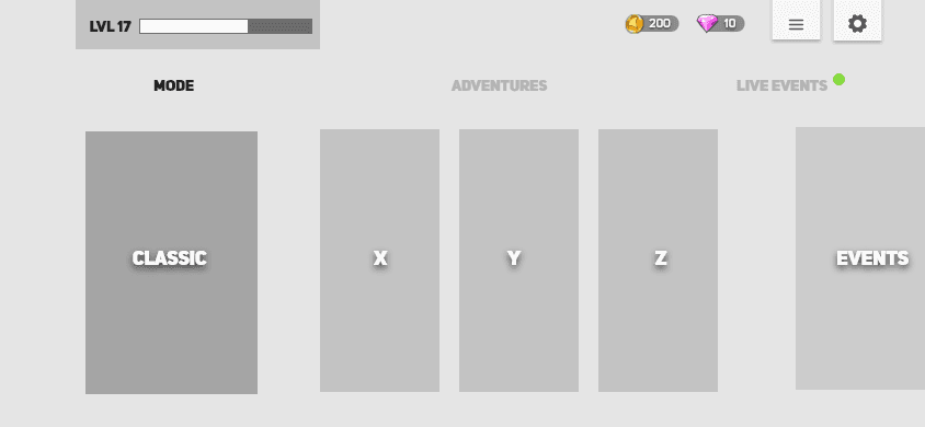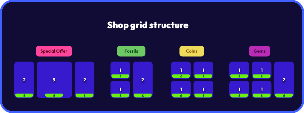 The shop is designed to scroll horizontally with navigation shortcuts in the bottom that lets the player snap to whichever subcategory they want. It is built to be live-ops friendly and modular, with block arrays easily substituted by game economists and live ops managers.